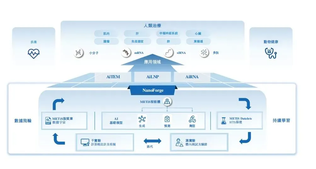数据层:METiS可电离脂质库,是NanoForge的数据宇宙,目前包含1000万种以上的脂质结构,其中相当数量的脂质得到超过20项关键特性的湿实验数据支持