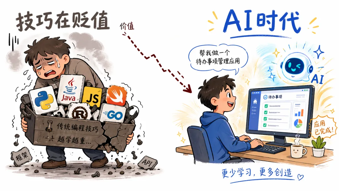 AI编程工具爆发之后,一个残酷的现实摆在我们面前:过去那些让人引以为傲的”技术技巧”,正在快速贬值。不是技巧没用了,而是门槛变了。
