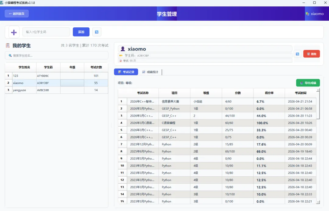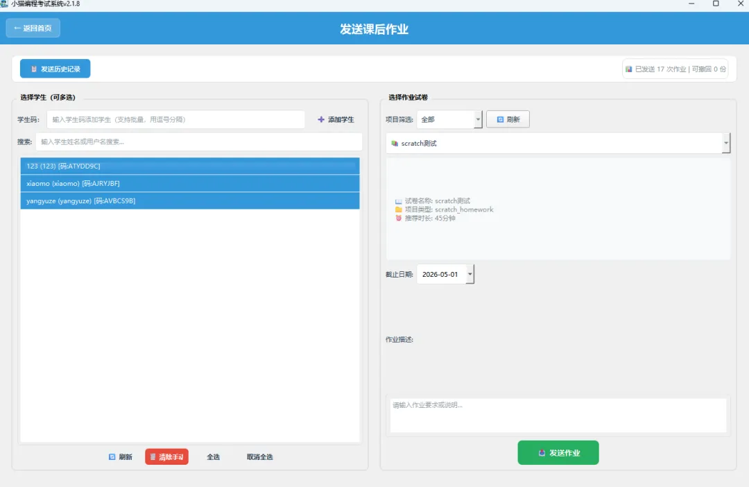 教师账号支持添加题目,给指定学生发送课后作业,支持撤回作业,支持查看学生考试成绩