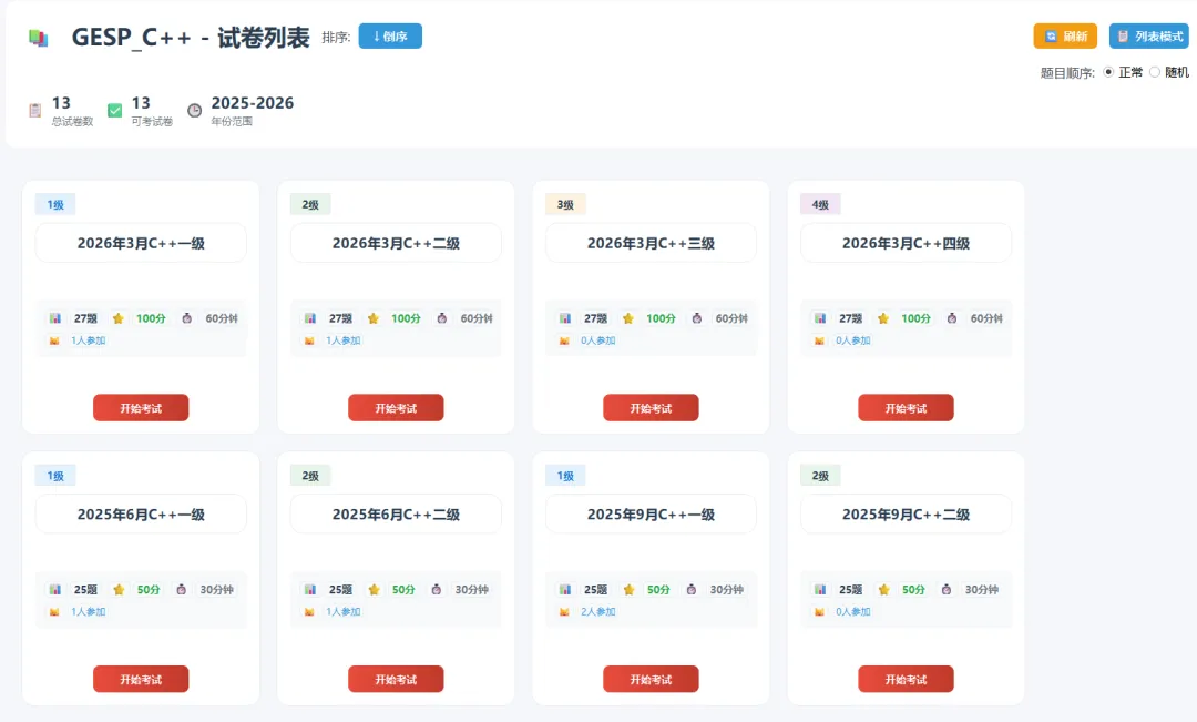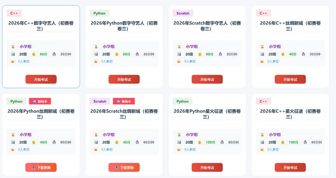 小猫编程模拟考级软件已经收录2026年信息素养大赛部分模拟题,包括C++,Python,Scratch,数字守艺人,星火征途,丝绸新城,智传民韵的小学组,初中组的模拟题,注册账号即可体验部分题目,想要体验完整的所有的试卷,需要29.9开通VIP即可全部体验,题库不断地更新中。。。