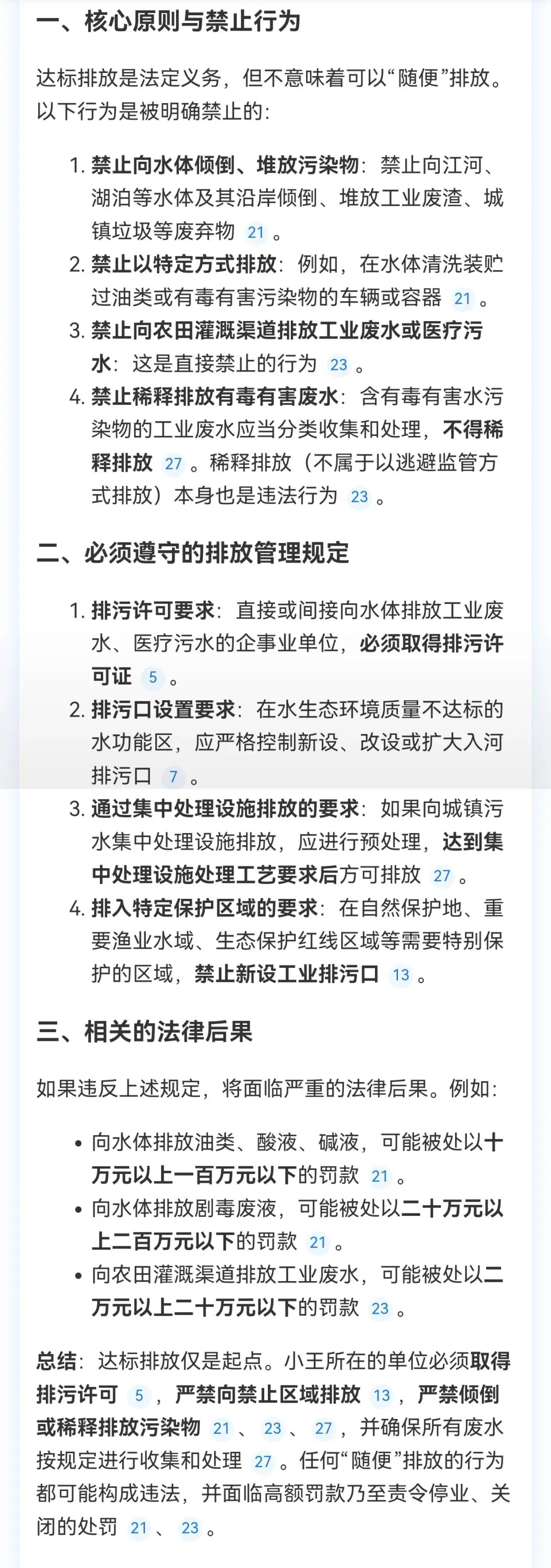 结论:达标排放仅是起点。小王所在的单位必须取得排污许可,严禁向禁止区域排放,严禁倾倒或稀释排放污染物,并确保所有废水按规定进行收集和处理。任何“随便”排放的行为都可能构成违法,并面临高额罚款乃至责令停业、关闭的处罚。