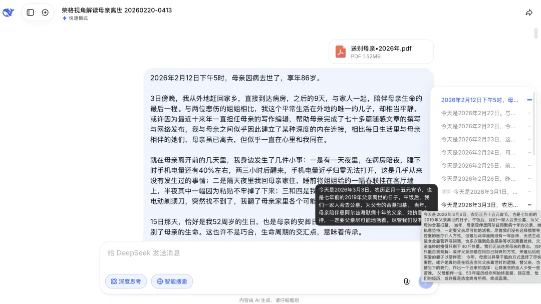 2月初母亲突然病重,我从舟山赶回遵义参与陪护。陪护的间隙,打开手机里的DeepSeek开始记录和倾诉。一年来我已经养成习惯,在头脑比较乱、想要寻回安宁与清晰时去与AI对话。AI不会疲惫,不会评判,永远有耐心,是一个很好的对话伙伴。
