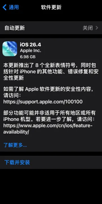 升级建议很明确。iPhone 11及以后的机型,走iOS 26.4.2;iPhone XS、XR这类跑不了iOS 26的老设备,苹果专门准备了iOS 18.7.8,一个不落下。入口在设置→通用→软件更新,几分钟的事。