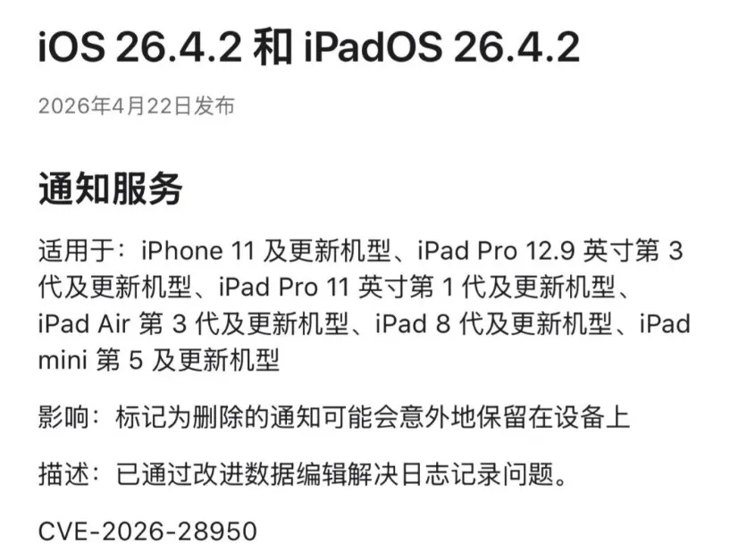 苹果突然推送双系统更新!彻底堵死iOS通知缓存泄密漏洞