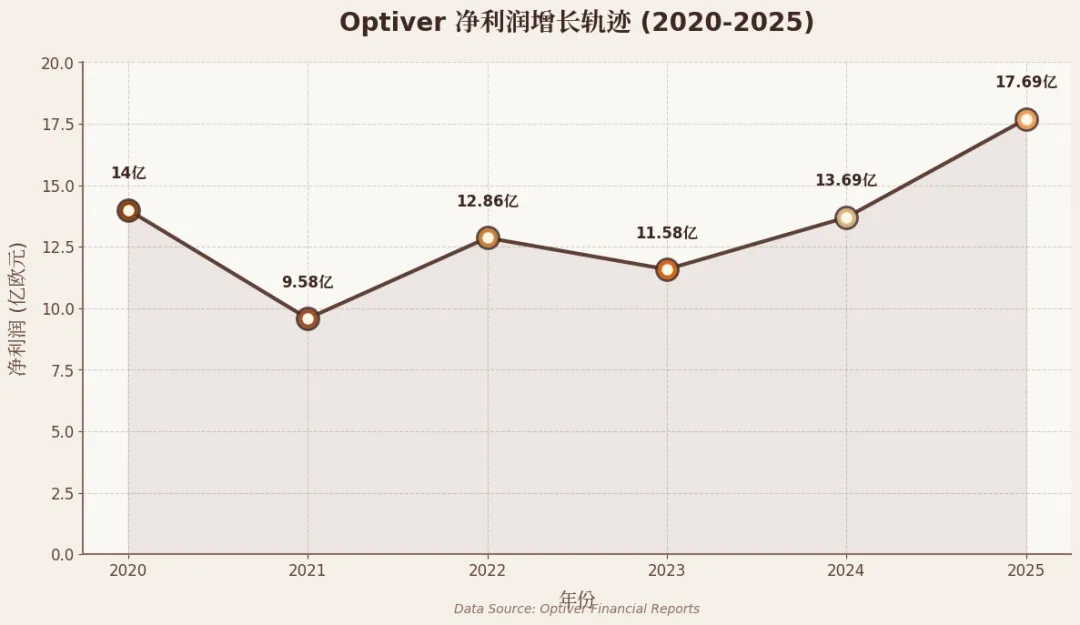 数字更能说明问题:2025 年,Optiver 实现了 17.69 亿欧元的净利润,交易收入高达 45.56 亿欧元。这个利润率(39%)超过了大多数科技巨头,更远高于传统投资银行。然而,它不为普通投资者服务,不管理养老金,也不发行 IPO。它用自己的资金交易,承担自己的风险,在买卖价差的毫厘之间捕获利润。