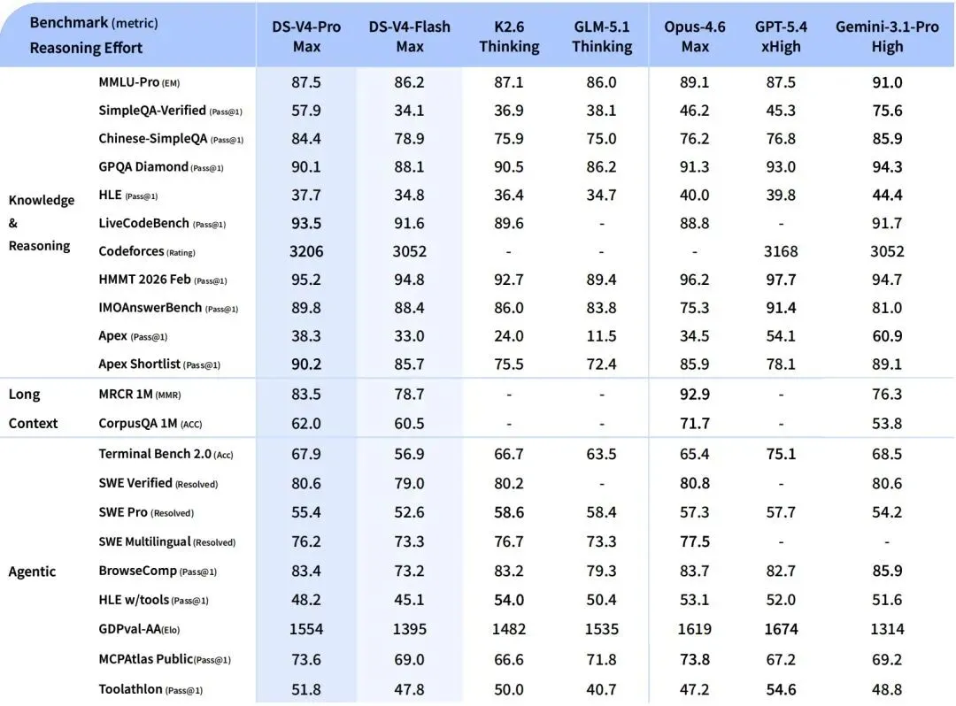 超大规模 MoE 架构(1.6T 参数/49B 激活) —— 在保持极致效率的同时,实现了性能的质的飞跃。DeepSeek V4-Pro 在多项基准测试中已经比肩 GPT-4o 和 Claude Sonnet 3.5 等顶级闭源模型。