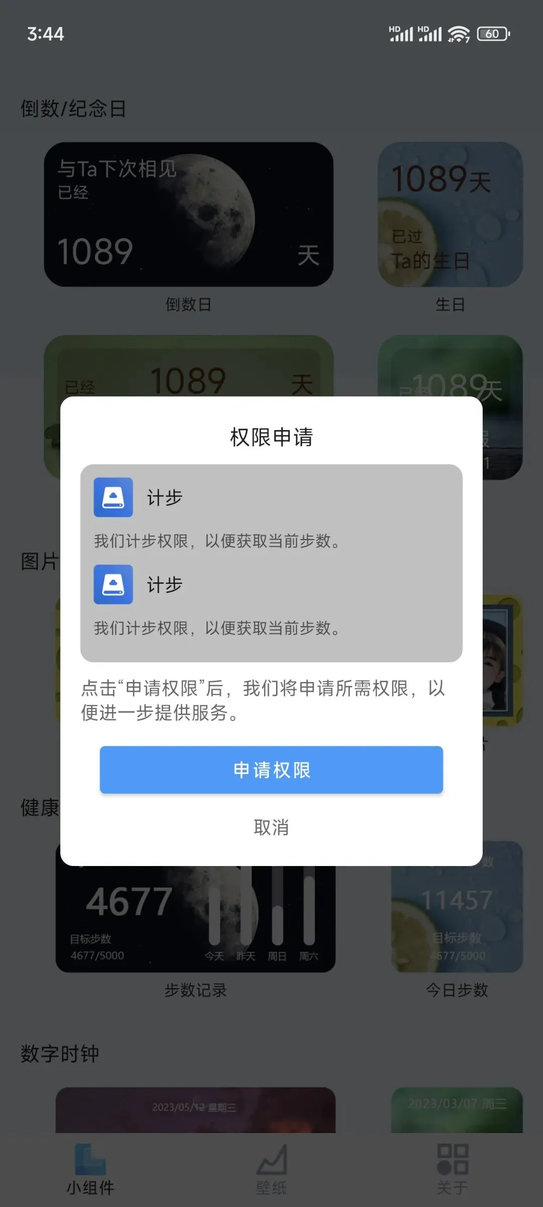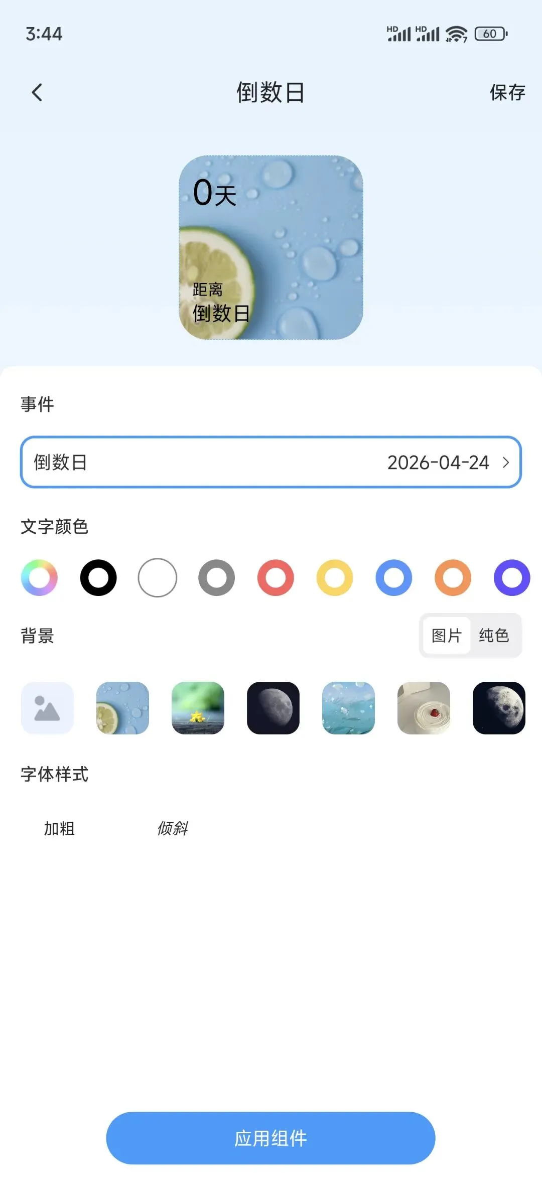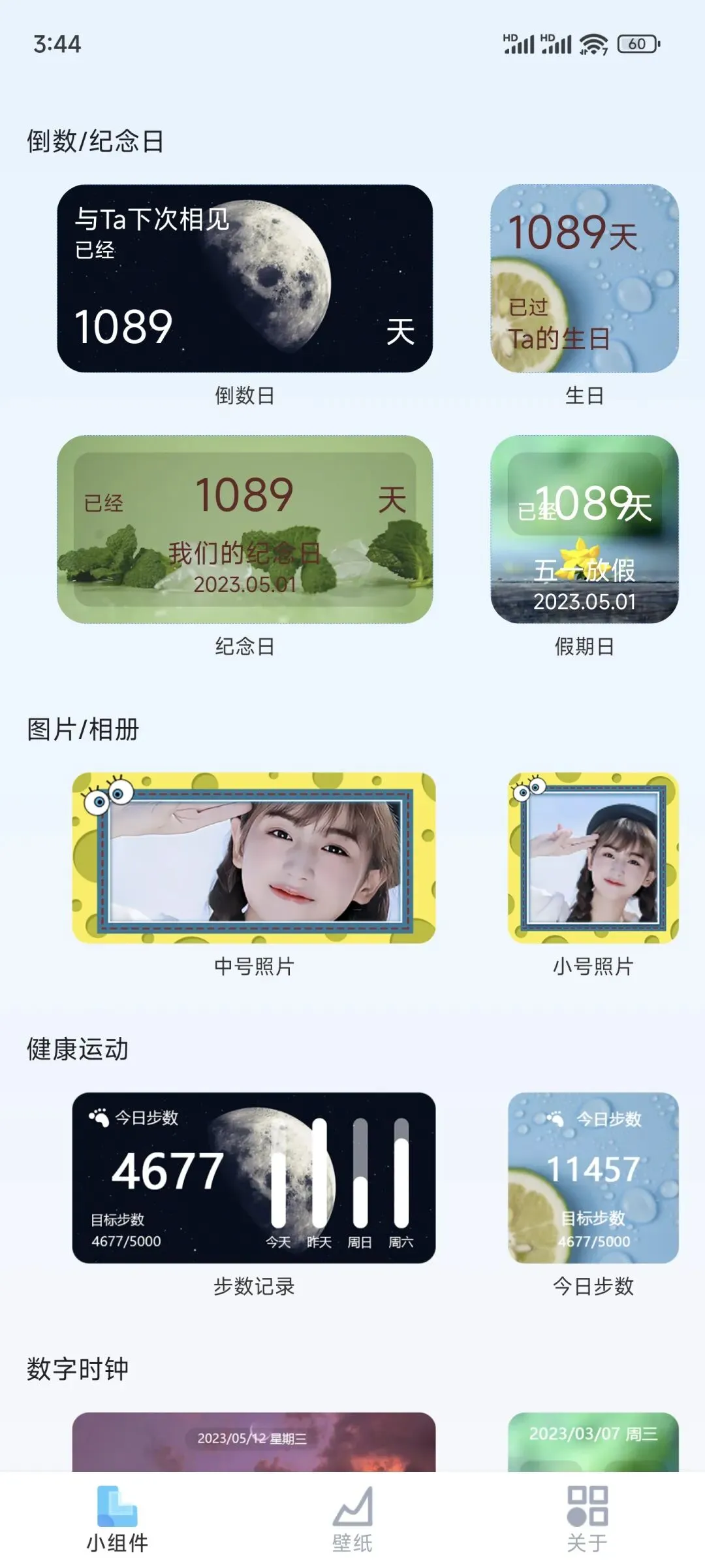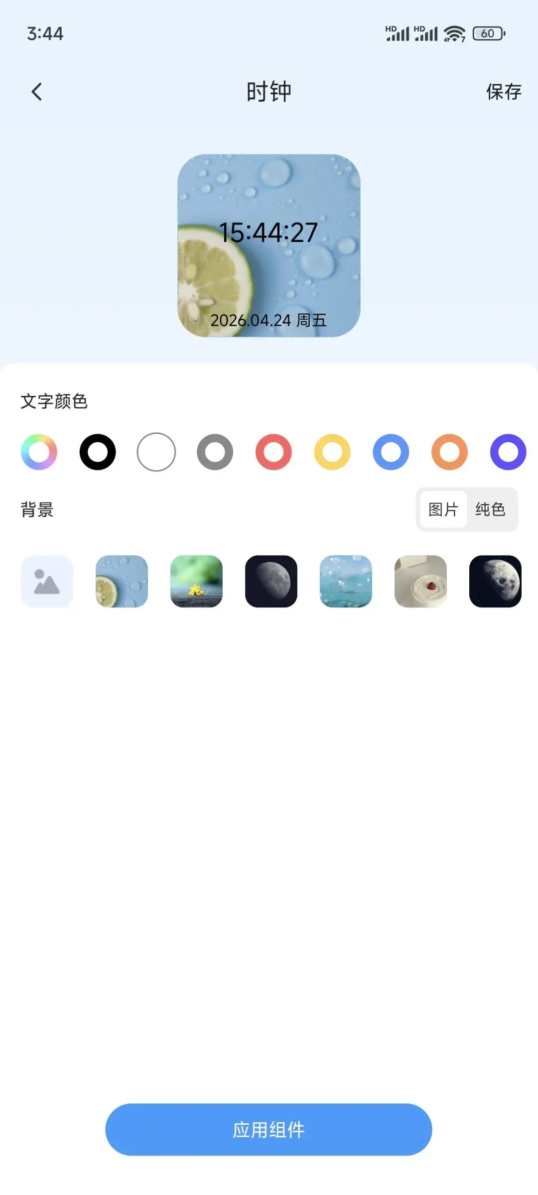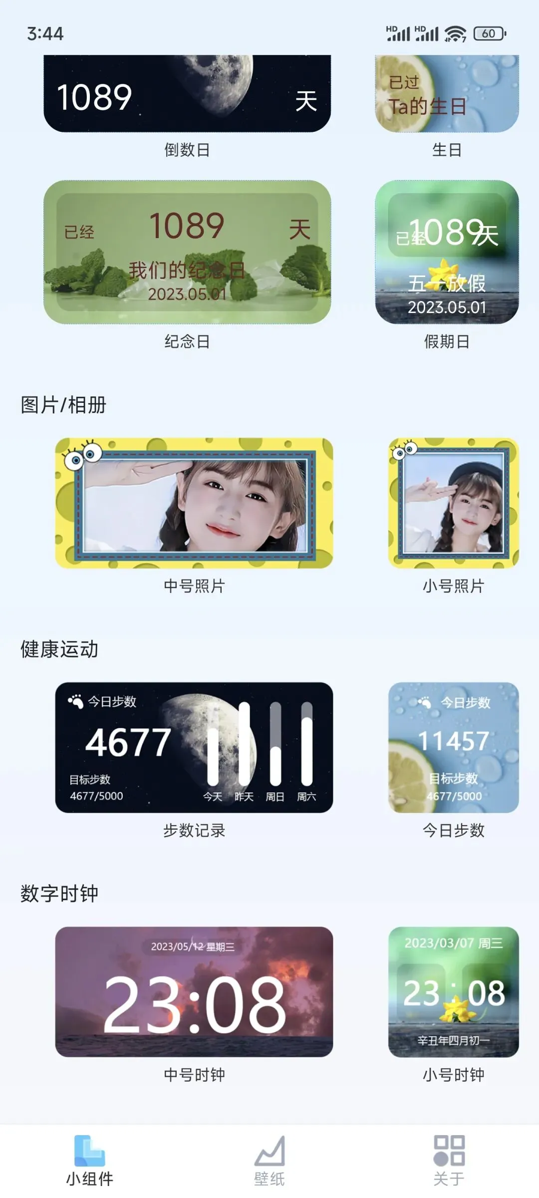特色在于它把组件拆得很细。除了常见的照片框、时钟,还有很多带点巧思的样式:能自定义背景透明度的倒数日卡、步数环、快捷便签。尤其透明组件适配做得不错,放在壁纸上不会像块补丁,融合感很强。
