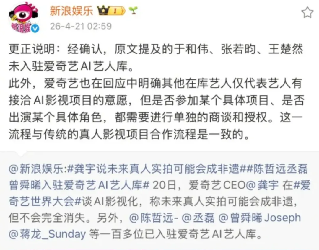 紧接着,于和伟、张若昀、王楚然等多位艺人通过工作室或官方渠道发布澄清,称未签署任何AI相关授权文件,部分团队表示将依法维护自身权益。同在21日凌晨,新浪娱乐发布更正说明,确认上述艺人并未入驻爱奇艺AI艺人库。爱奇艺随即转发了该微博,并作出了前述声明。(来源:界面新闻)