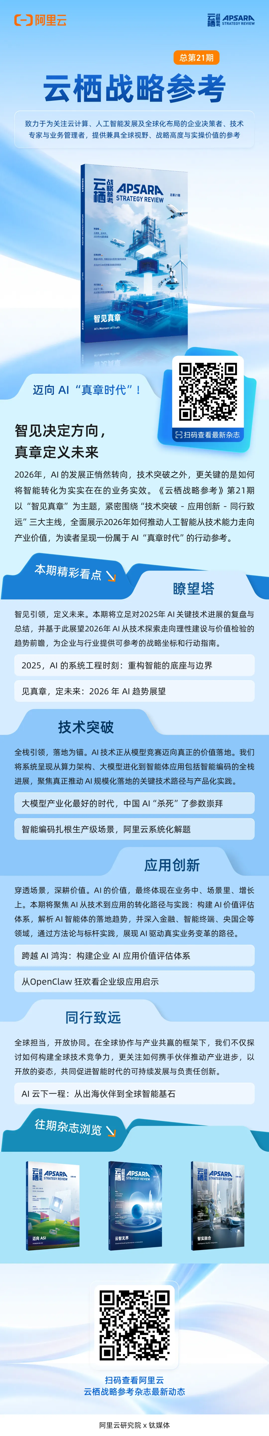 《云栖战略参考》第21期以 “智见真章” 为主题,正是希望回归到一个本质命题:在 AI 从技术能力走向生产力的今天,我们如何走出实验室、走进生产线,如何跨越演示阶段、实现规模化落地?