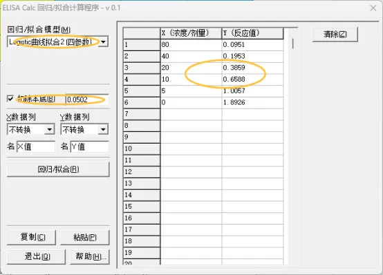 打开软件ELISACalc,选择(四参数),如有空白值或者背景值,可勾选扣除本底,然后复制表格中底色填充为白色的数据,点击软件中的“粘贴”按钮,得到如下图: