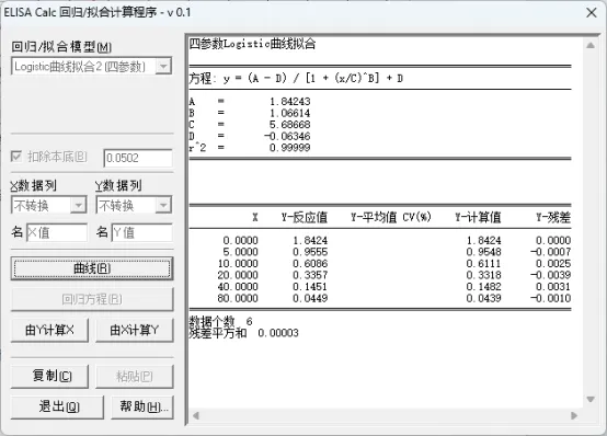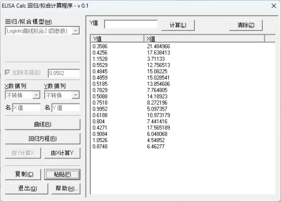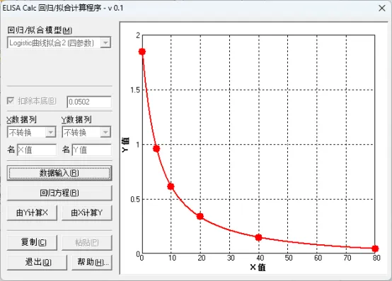 ELISACalc是一款回归和拟合数据的计算程序,能够用来计算直线回归、二次曲线回归、四参数曲线回归等。一般直线回归曲线及多项式拟合在EXCEL表格中即可完成,建议四参数回归曲线拟合的时候使用ELISACalc软件更便捷。ELISACalc软件与CurveExpert相比较,能选取的拟合模型种类较少,优点是操作简单,可以结合excel表格处理数据方便复制粘贴,计算大批量数据时有明显优势。