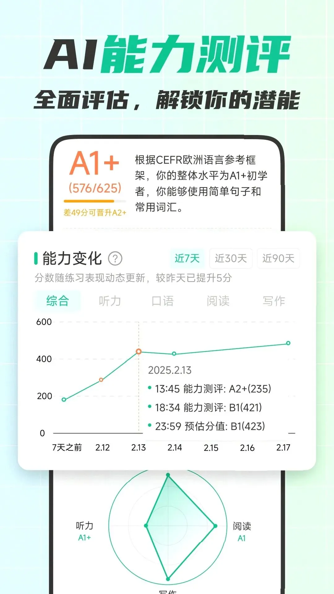 可视化学习报告:每周生成个人学习档案,用数据直观展示发音准确率、词汇积累量、教材掌握进度、流利度提升轨迹,进步一目了然。