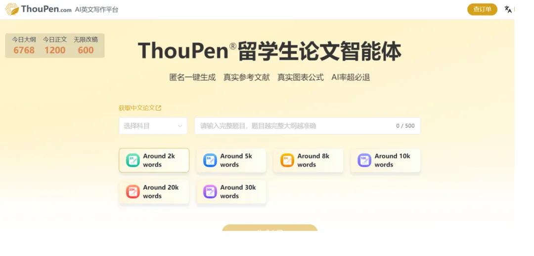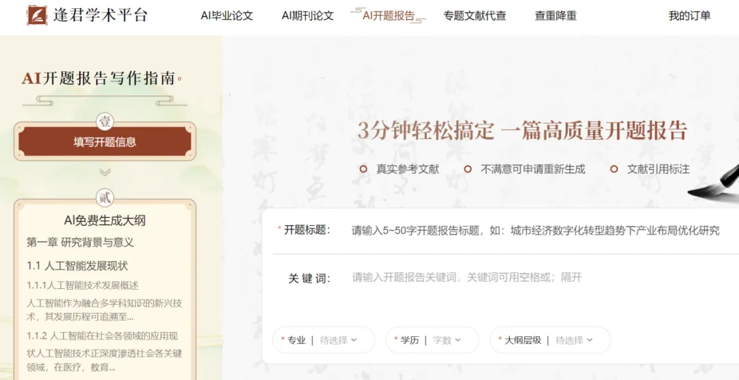 逢君学术的使用流程非常直观。你只需要输入论文标题,选择或填写专业,然后选择对应的学历和字数要求。系统会根据这些信息快速整理出一份完整的开题报告大纲。