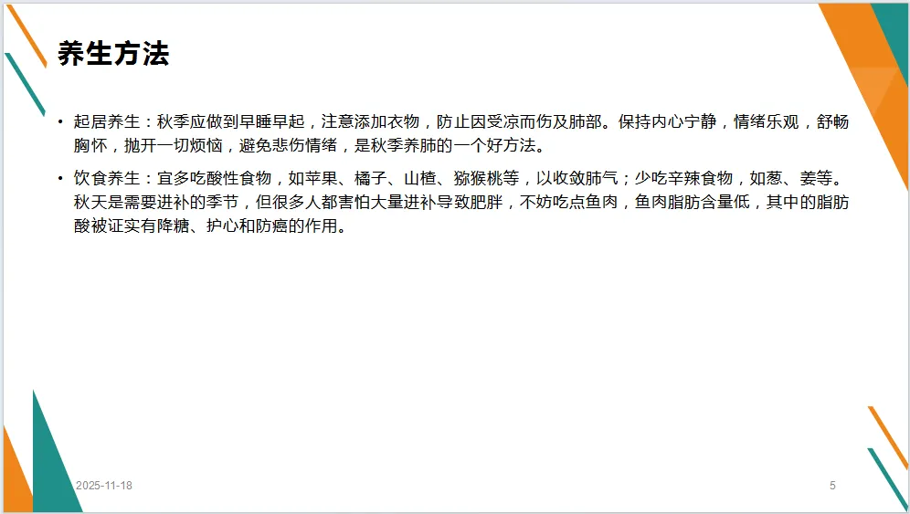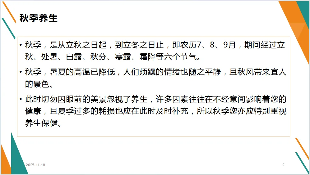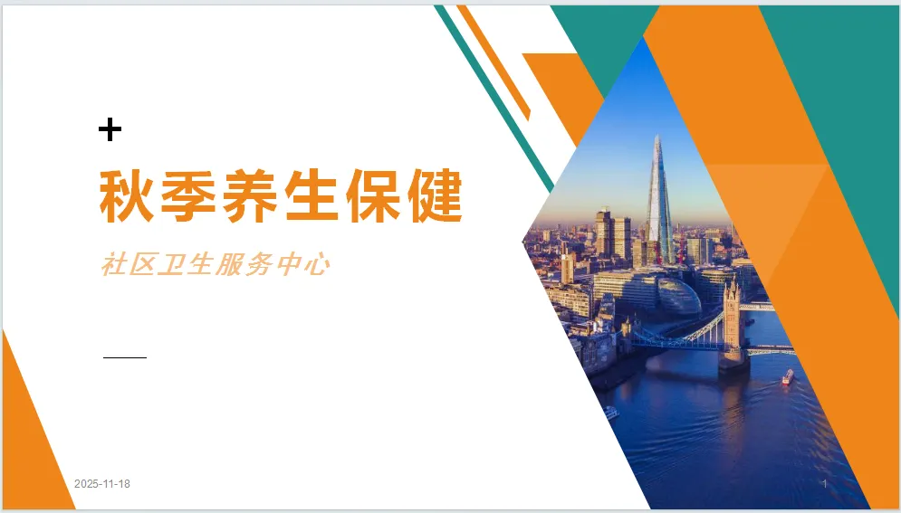 2.第一张幻灯片版式为“标题幻灯片”;主标题为“秋季养生保健”设置字体颜色,巧克力黄,着色4,副标题为“社区卫生服务中心”,副标题字体设置为黑体、28磅字,巧克力黄,着色3,浅色40%。
