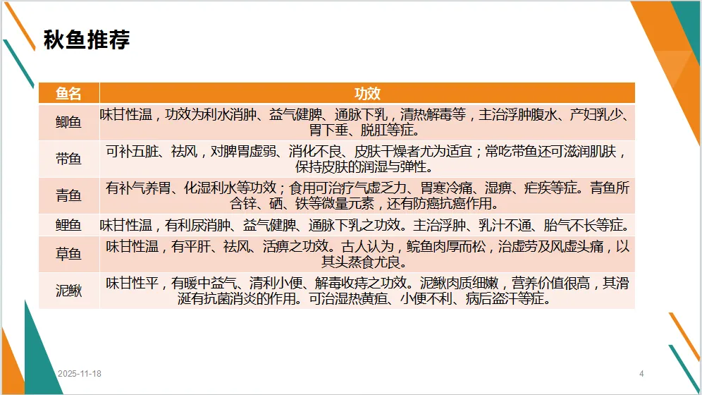 5.第四张幻灯片内容区插入7行2列表格,设置一个合适的表格样式,第1列列宽为3厘米,第2列列宽为26厘米。第1行第1、2列内容依次为“鱼名”和“功效”,参考文件夹下SC.docx文档的内容,按鲫鱼、带鱼、青鱼、鲤鱼、草鱼、泥鳅的顺序从上到下将适当内容填入表格其余6行,并将表格文字全部设置为水平及垂直居中对齐。