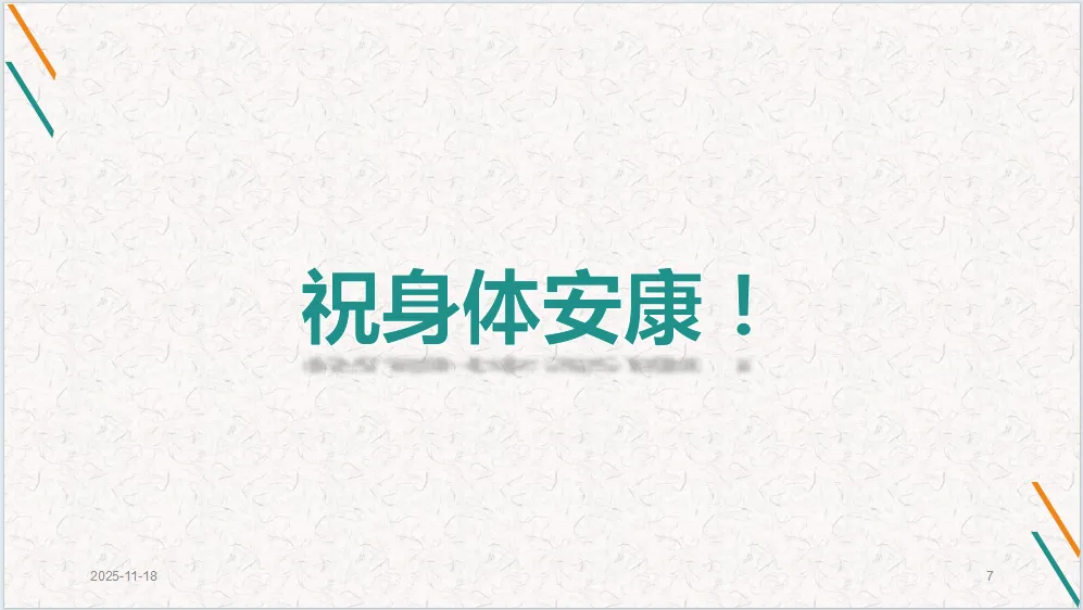 6.第七张幻灯片版式为“空白”,插入预设样式为“填充-海洋绿,着色5,轮廓-背景1,清晰阴影-着色5”的艺术字“祝身体安康!”,艺术字形状效果设置为“阴影-透视-靠下”;将该页幻灯片的背景设置为“纸纹2”纹理填充。(设计选项卡-背景-纹理填充)
