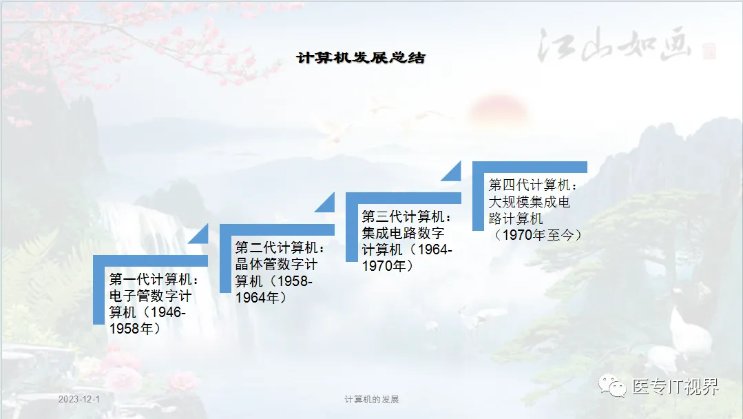9、第七张幻灯片标题内容为“计算机发展总结”,删掉文本占位符,在空白处插入“步骤上移流程”智能图形,输入计算机发展的四个阶段的名称和时间。
