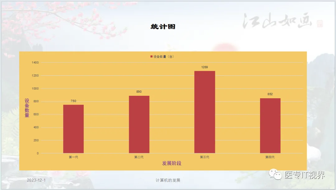 10、根据素材“演示文稿–素材.docx”中的表格内容,在第八张幻灯片中插入一个柱形图,要求:图表以“发展阶段”为横坐标标题,“设备数量”为纵坐标标题,图表显示数据标签;设置一个合适的图表样式,图表无标题,在顶部显示图例。