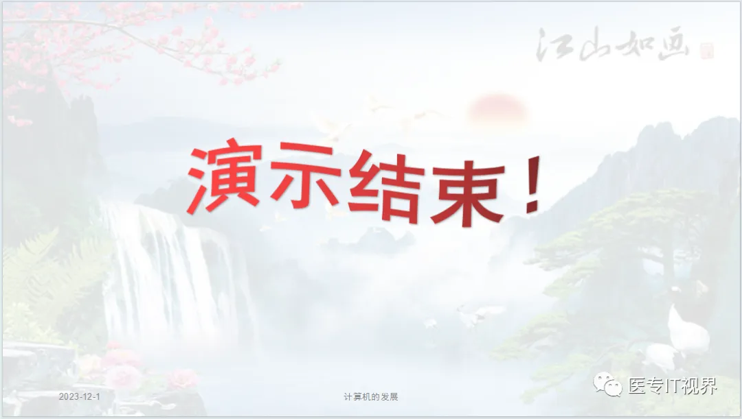 11、为每张幻灯片的页脚插入“计算机的发展”六个字和自动更新的时间,且标题幻灯片不显示;在第9张幻灯片中插入艺术字,内容为“演示结束!”。