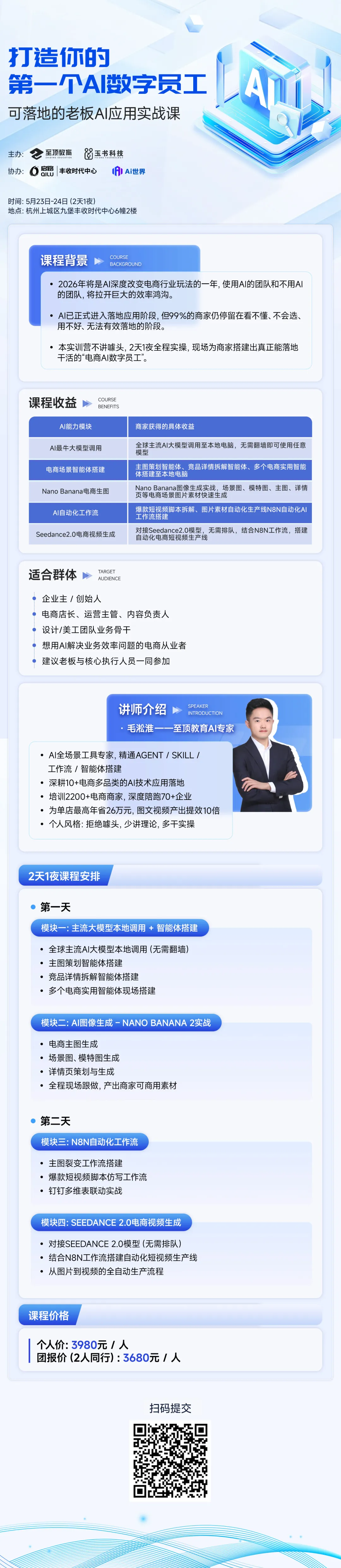 为破解商家AI转型难题,至顶教育联合Ai世界,重磅推出老板AI应用实战课,定于5月23日-24日,在杭州上城区九堡丰收时代中心开启2天1夜沉浸式实训。