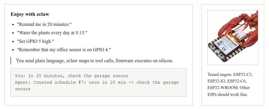 作者做了近乎变态的体积优化,当前默认编译的固件才833KB,还剩54KB的空余给你加自定义功能。其中zclaw本身的AI助手逻辑才不到39KB,仅占全固件的4.6%——这代码优化水平,只能说一句大佬恐怖如斯😱