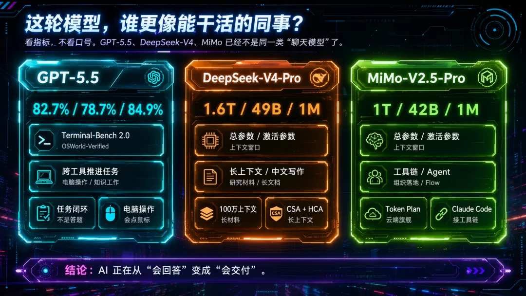 GPT-5.5 更像会推进任务的执行位,DeepSeek-V4-Pro 更像能把超长材料啃完的研究位,GLM-5.1 更像长程交付位,MiMo-V2.5-Pro 更像能接工具链、接流程的组织位。