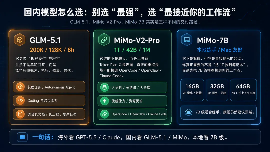 GPT-5.5 / Claude:做高难度推理、 computer use 、复杂交付GLM-5.1:做长程任务、工程协作、持续执行MiMo:做工具链、 Agent 编排、组织落地MiMo-7B:做本地实验、轻量调试、 Mac 练手真正的答案,不是选模型,是搭系统