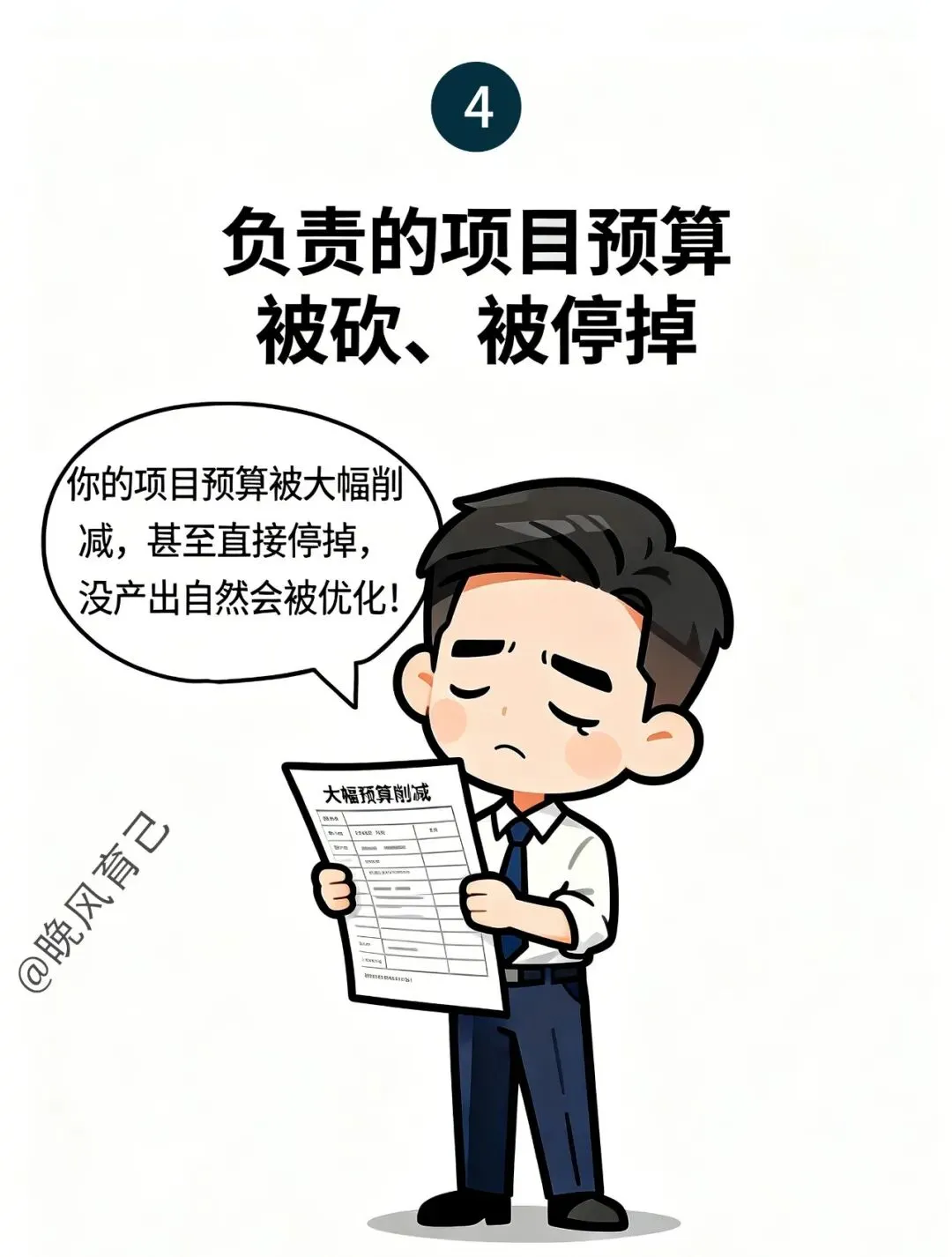 - 负责的项目预算被砍或停掉:你手上的项目开始被大幅削减预算,甚至直接叫停了,也就意味着你的产出价值被否定了,同时也失去了存在的必要性。