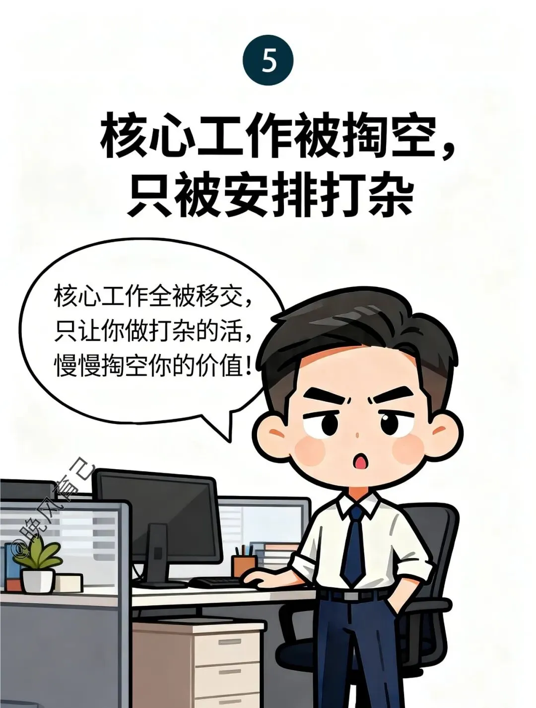 - 核心工作被掏空,只剩打杂:核心业务已经被全部移交了出去,只安排你做一些无意义的杂活,公司正在一步步降低你的价值,为后续裁员做铺垫。