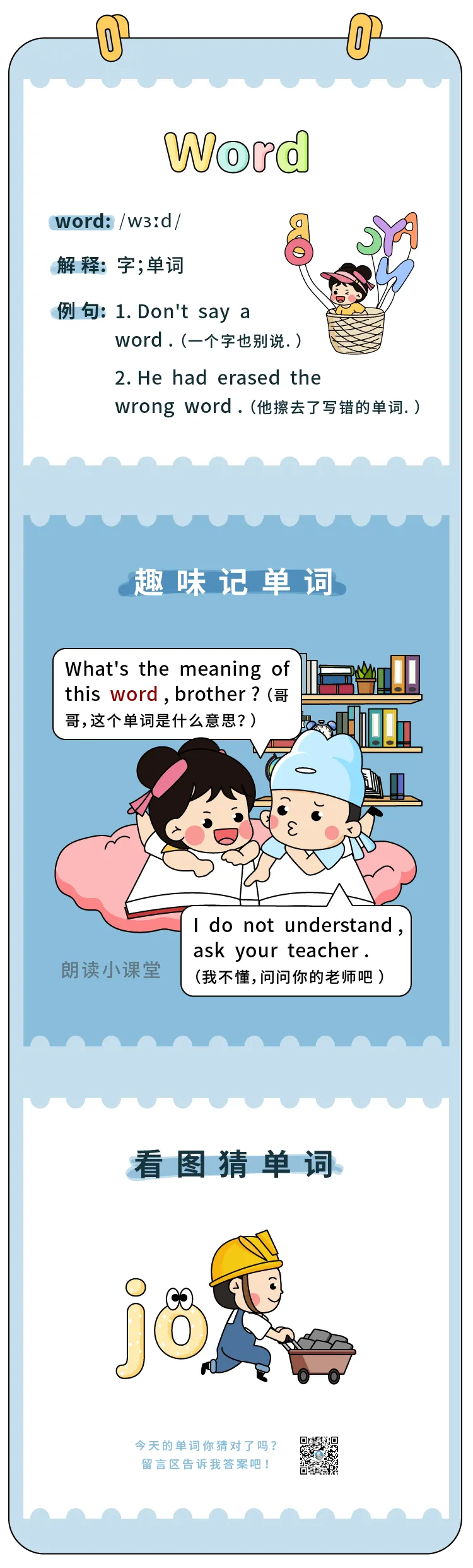 【单词漫画091】 word(字;单词) ▲点上方绿标,跟着朗读君,看漫画,学单词 作者丨朗读君 来源丨朗读君英语(id:langdujun170) 更多英语工具 点击下方卡片,学习吧! ▼ 点击下方图片 一起看看看【正确答案】 ▼ 学会了在这里集合~
