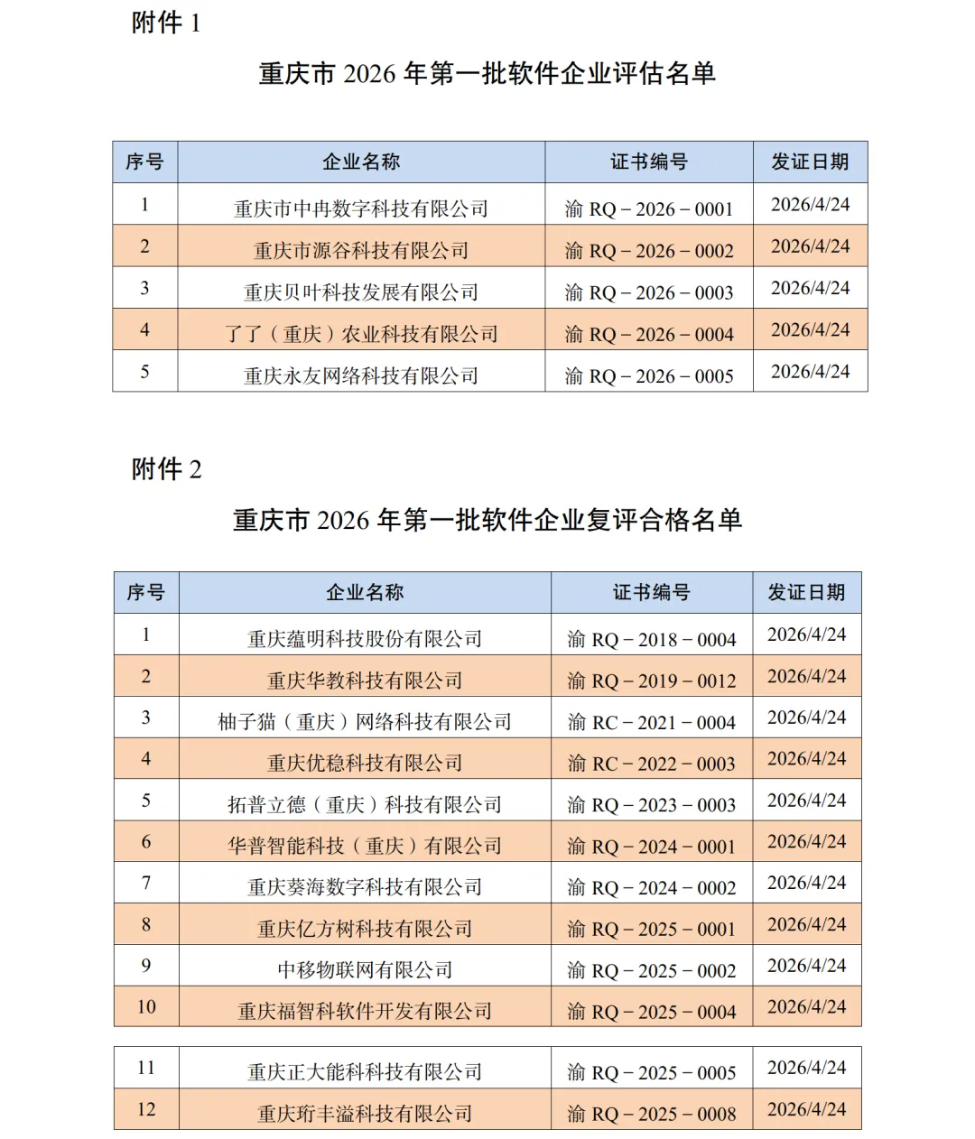 根据国务院《进一步鼓励软件产业和集成电路产业发展的若干政策》(国发〔2011〕4号)、中国软件行业协会《软件企业评估标准》(T/SIA 002-2019)及有关文件规定,经企业自愿申报,重庆市软件行业协会组织专家评审,重庆市中冉数字科技有限公司等5家企业拟通过软件企业评估,重庆蕴明科技股份有限公司等12家企业拟通过软件企业复评。现予以公示,公示期五天,经中国软件行业协会双软评估公共服务平台(https://srpg.csia.org.cn)及重庆市软件行业协会网站公示无异议后,颁发软件企业证书。未参加复评或复评未通过的企业,软件企业证书有效期满后,证书自动失效。