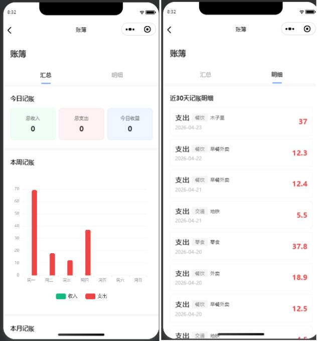 •收支记录:您可以随时记录每一笔收入或支出。只需提供金额、类别(如餐饮、交通、工资等)、交易日期和简要描述,系统便会为您妥善保存。