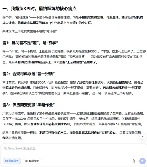 DeepSeek像是一个逻辑极其严密的冷面高管。它根本不和你扯表面的东西,直接切中了合规背后的业务风险,指出了“批次间差异导致实验重头再来”和“审计溯源时的合规材料缺失”等致命问题。