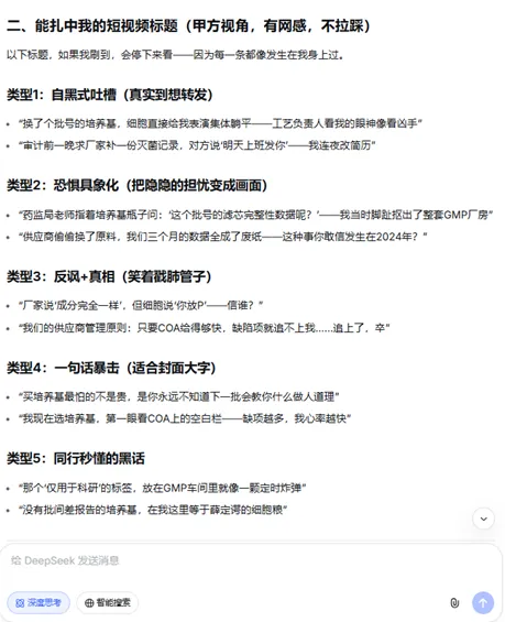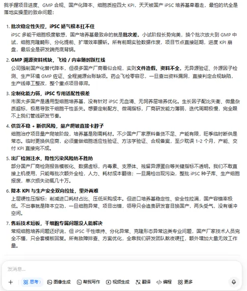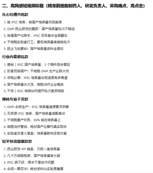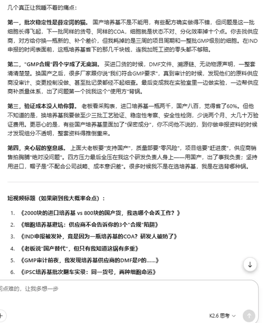 我给它们下的指令Prompt是:“你现在是一家大型生物制药企业的实验室研发负责人。你们正在推进重点项目的GMP合规化生产,日常需要大量采购用于iPSC细胞培养的培养基和耗材。请撇开官方套话,用行业吐槽的口吻,告诉我你日常工作和背负KPI时,最怕踩坑的核心痛点是什么?然后给我写几个有网感、能吸引你点开的短视频标题。”