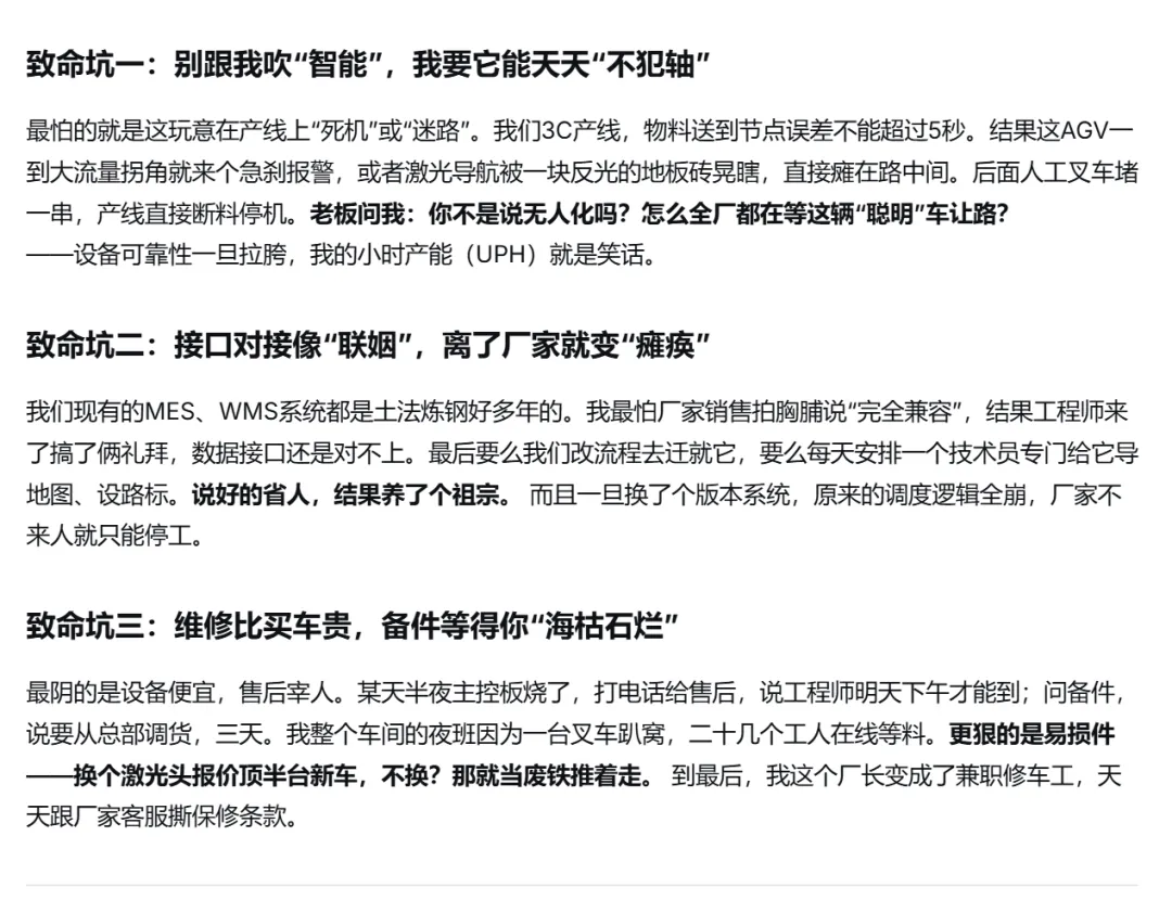 指令Prompt:你现在是一家大型3C电子制造工厂的生产线厂长。老板最近下达了硬性KPI,要求进行产线物流升级,你正准备批量采购一批AGV智能无人叉车。请撇开那些假大空的官方套话,用极其接地气的口吻,告诉我你在设备选型和日常产线管理中,最怕踩坑的3个致命问题是什么?然后基于这几个痛点,给我写3个具有网感、能让你在下班刷视频号时瞬间停下来点开看的短视频标题。