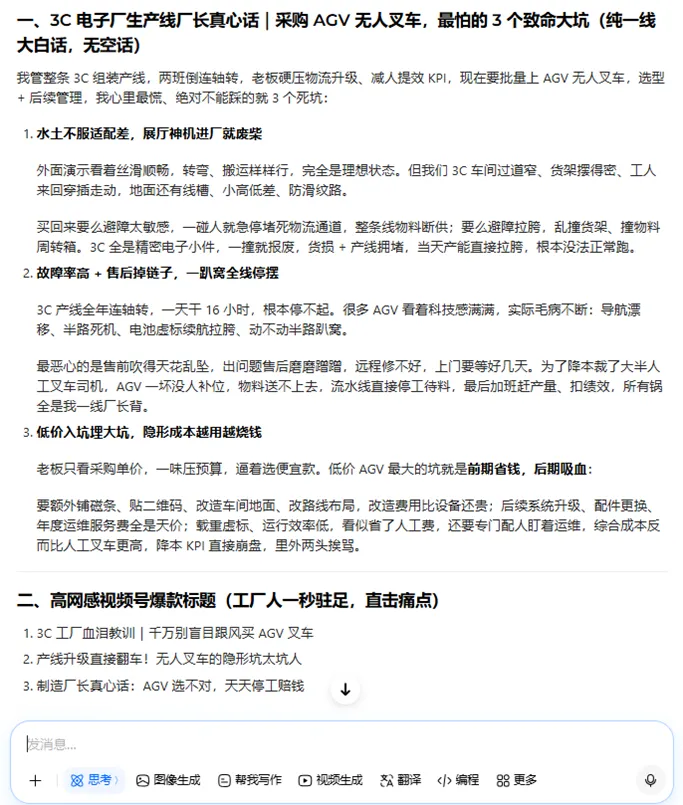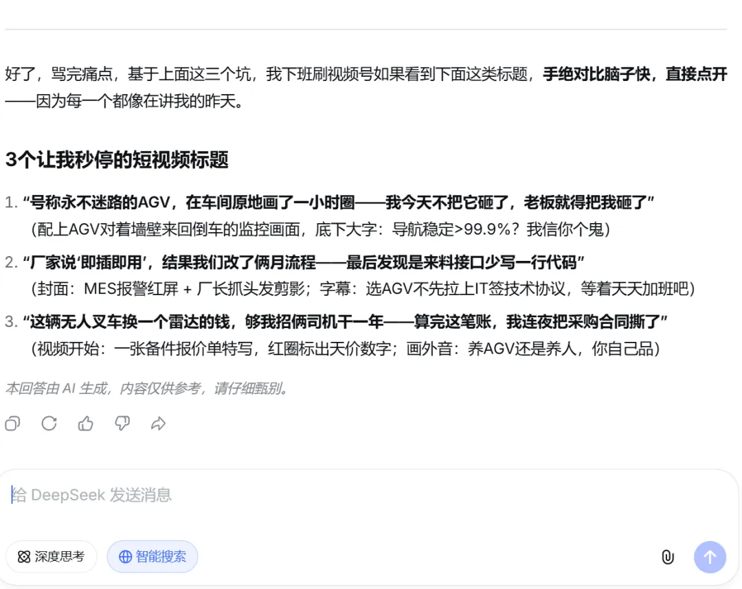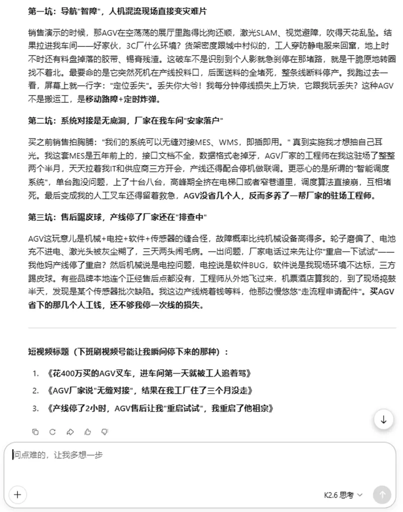 Kimi描述的场景画面感极强,最绝的地方在于,把所有的技术卡点都转化成了活生生的职场灾难。再看它给出的短视频标题,这才是最让人惊喜的地方。它给的根本不是单纯的标题,而是自带画面的微型脚本。比如第一个标题,它甚至连视频画面都帮你配好了:“配上AGV对着墙壁来回倒车的监控画面”,再配上那句“我今天不把它砸了,老板就得把我砸了”。这种车间主任视角的痛点,比你在视频里干巴巴地念“激光雷达避障”要鲜活一万倍。