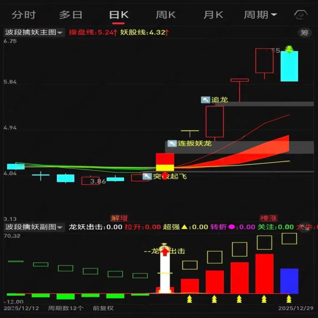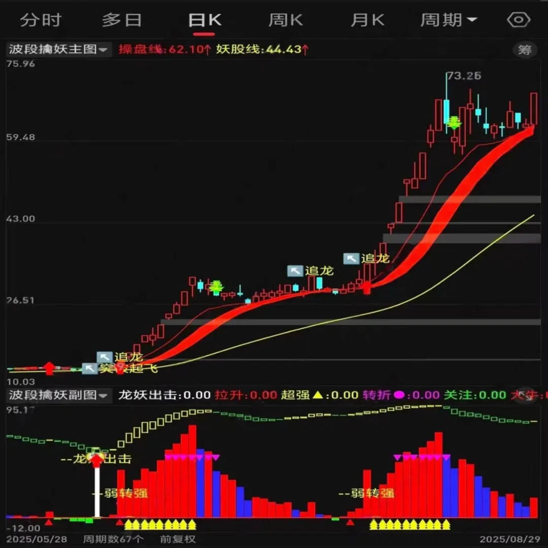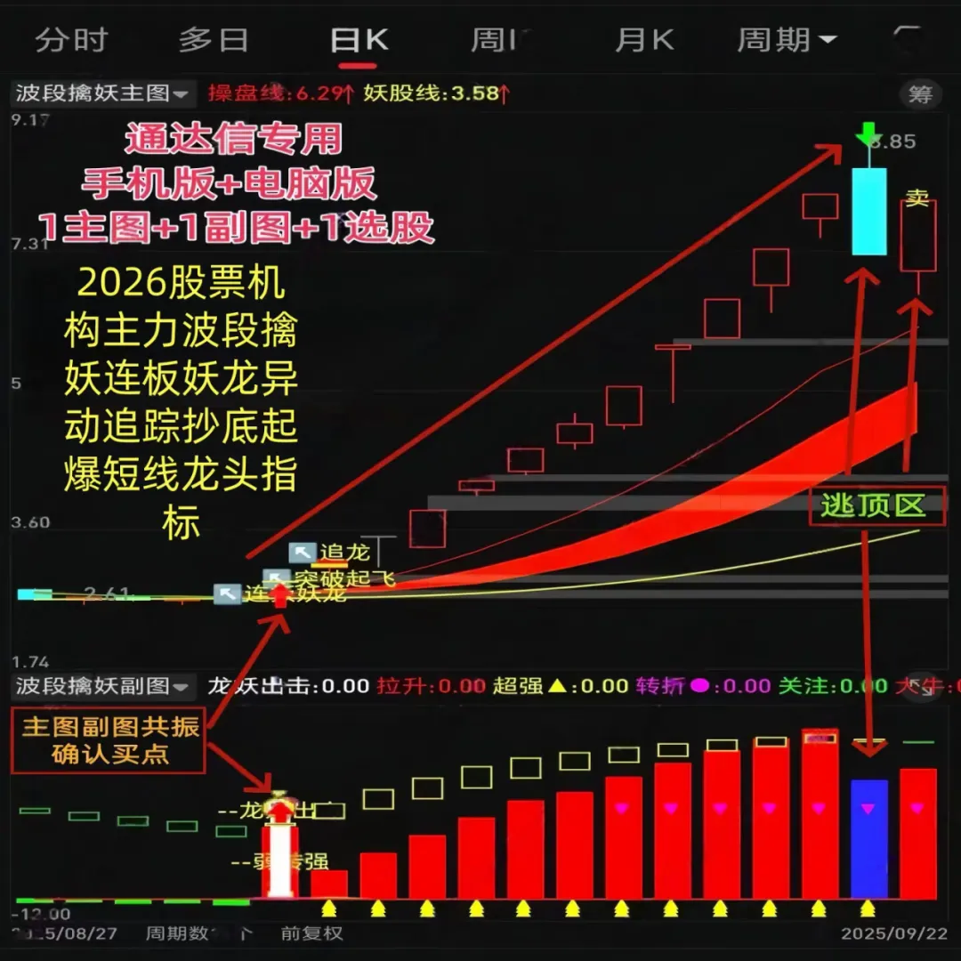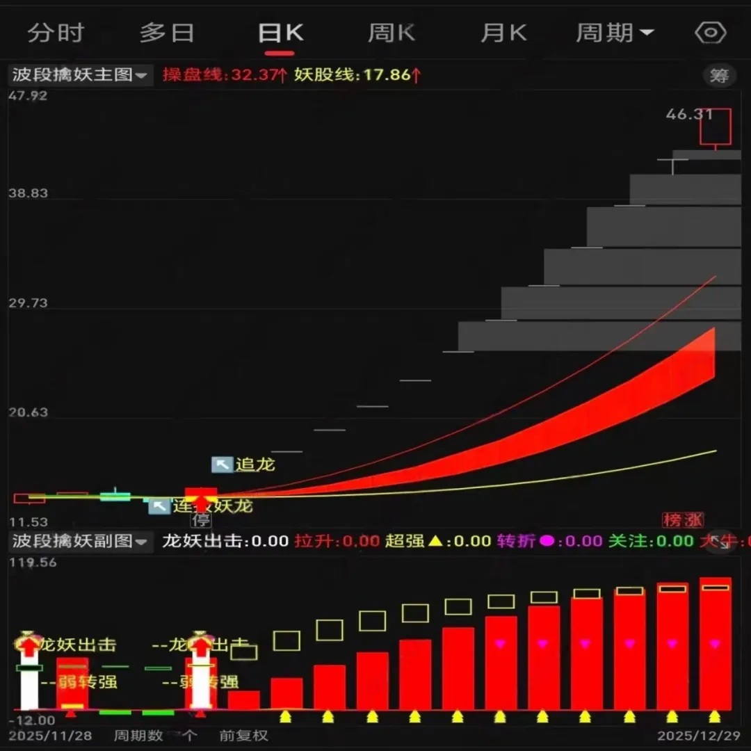GRCY1:=(CLOSE-MA(CLOSE,20))/MA(CLOSE,20)*100; GRCY2:=IF(GRCY1>0,GRCY1,0); STICKLINE(GRCY1>0,GRCY1,0,3,0),COLORRED; STICKLINE(GRCY1>0 AND C<REF(C,1),GRCY1,0,3,0),COLORFF2626; GRCY3:=EMA(CLOSE,2)-EMA(CLOSE,150); GRCY4:=EMA(GRCY3,100); GRCY5:=2*(GRCY3-GRCY4); GRCY6:=POW(GRCY5,3)*0.1+POW(GRCY5,1); 转强:=(CLOSE-MA(CLOSE,25))/MA(CLOSE,25)*100; GRCY7:=MA(转强,17)+MA(转强,17)-REF(MA(转强,17),1); GRCY8:=IF(MA(转强,17)<GRCY7,GRCY7,MA(转强,17)); 趋势线:=GRCY8-(EMA(转强,17)-GRCY8)*0.98; GRCY9:=CROSS(转强,趋势线) AND 转强>REF(转强,1) AND 趋势线<REF(趋势线,5); DRAWTEXT(GRCY9,转强,’●’),COLORF00FF0; STICKLINE(GRCY9,0,40,3,0),COLORRED; DRAWTEXT(GRCY9,20,’–弱转强’),COLORYELLOW; 不参与:STICKLINE(GRCY1<0,GRCY1,0,3,0),COLORGREEN; GRCY10:=EMA(C,10); GRCY11:=EMA(C,20); GRCY12:=EMA(C,30); GRCY13:=ABS(GRCY10-GRCY11)+ABS(GRCY11-GRCY12); GRCY14:=GRCY13/C<1/100 AND GRCY10>REF(GRCY10,1) AND GRCY11>REF(GRCY11,1); STICKLINE(GRCY14,0,4,2,0),COLORYELLOW; GRCY15:=EMA(CLOSE,7); GRCY16:=EMA(CLOSE,14); GRCY17:=EMA(CLOSE,25); GRCY18:=EMA(CLOSE,55); GRCY19:=ABS(GRCY15-GRCY16)+ABS(GRCY16-GRCY17)+ABS(GRCY17-GRCY18); GRCY20:=GRCY13/C<1/100 AND GRCY15>REF(GRCY15,1) AND GRCY16>REF(GRCY16,1) AND GRCY17>REF(GRCY17,1); 龙妖出击:CROSS(C,GRCY15) AND CROSS(C,GRCY16) AND CROSS(C,GRCY17) AND CROSS(C,GRCY18) AND GRCY15>REF(GRCY15,1) AND GRCY16>REF(GRCY16,1) AND GRCY17>REF(GRCY17,1) AND GRCY18>REF(GRCY18,1),COLORWHITE; STICKLINE(龙妖出击,0,50,1.5,0),COLORWHITE; DRAWTEXT(龙妖出击,49,’–龙妖出击’),COLORYELLOW; DRAWICON(龙妖出击,51,25); DRAWICON(龙妖出击,53,9); DRAWICON(龙妖出击,48,1); GRCY21:=MA(CLOSE,10)-EMA(CLOSE,10)*100; GRCY22:=MA(GRCY21,5); GRCY23:=3*(GRCY22-GRCY21); 拉升:CROSS(GRCY23,20),COLORRED; DRAWTEXT(拉升,-4,’▲’),COLORRED; 超强信号:=H/MA(H,5)*(1+5/100); 超强▲:CROSS(超强信号,1.15),COLORYELLOW; GRCY24:=IF(超强信号>=1.15,1,0); DRAWTEXT(GRCY24,-4,’▲’),COLORYELLOW; DRAWTEXT(GRCY24,-8,’▲’),COLORYELLOW; DRAWTEXT(GRCY24,-12,’▲’),COLORYELLOW; GRCY25:=EMA(C,3); GRCY26:=REF(CLOSE,1); GRCY27:=SMA(MAX(CLOSE-GRCY26,0),4,1)/SMA(ABS(CLOSE-GRCY26),4,1)*100; GRCY28:=(HIGH+LOW+CLOSE)/3; GRCY29:=(GRCY28-MA(GRCY28,500))/(0.015*AVEDEV(GRCY28,500)); GRCY30:=(CLOSE-LLV(LOW,500))/(HHV(HIGH,500)-LLV(LOW,500))*100; GRCY31:=CLOSE-REF(CLOSE,500); GRCY32:=(GRCY29<-100) AND (GRCY30<20) AND (GRCY31<0) AND (GRCY27<15); 转折●:GRCY9,COLORF00FF0; 关注:IF(GRCY32,20,0),STICK,COLORGREEN; GRCY33:=(CLOSE-LLV(LOW,89))/(HHV(HIGH,89)-LLV(LOW,89))*100; GRCY34:=SMA(GRCY33,3,1); GRCY35:=SMA(GRCY34,3,1); GRCY36:=(CLOSE-LLV(LOW,27))/(HHV(HIGH,27)-LLV(LOW,27))*100; GRCY37:=SMA(GRCY36,3,1); 顶:=IF(CROSS(GRCY35,50) AND GRCY37>REF(GRCY37,1) AND GRCY37>70,90,0); DRAWTEXT(顶,0,’◆’),COLOR00FF00; 大牛:0,COLORRED; GRCY38:=20; GRCY39:=4; GRCY40:=2; GRCY41:=30; GRCY42:=(CLOSE-LLV(LOW,GRCY38))/(HHV(HIGH,GRCY38)-LLV(LOW,GRCY38))*100; GRCY43:=SMA(GRCY42,GRCY39,1); GRCY44:=SMA(GRCY43,GRCY40,1); 机构减仓:=(GRCY44>82 AND GRCY43>89)*20; 临界顶:=(GRCY44>85 AND GRCY43>95)*20; DRAWTEXT(机构减仓=20,50,’▼’),COLORF00FF0; DRAWTEXT(临界顶,60,’▼’),COLORGREEN; GRCY45:=(HHV(H,13)-LLV(L,13)); GRCY46:=(HHV(H,13)-C); GRCY47:=(C-LLV(L,13)); GRCY48:=GRCY46/GRCY45*100-70; GRCY49:=(C-LLV(L,55))/(HHV(H,55)-LLV(L,55))*100; GRCY50:=(2*C+H+L)/4; GRCY51:=SMA((GRCY47/GRCY45*100),3,1); GRCY52:=LLV(L,34); GRCY53:=SMA(GRCY51,3,1)-SMA(GRCY48,9,1); GRCY54:=IF(GRCY53>100,GRCY53-100,0); GRCY55:=HHV(H,34); 防线:=EMA((GRCY50-GRCY52)/(GRCY55-GRCY52)*100,8); GRCY56:=EMA(防线,5); GRCY57:=REF(防线-GRCY56<0,5) AND REF(防线-GRCY56<0,4) AND REF(防线-GRCY56<0,3) AND REF(防线-GRCY56<0,2) AND REF(防线-GRCY56<0,1) AND CROSS(防线>GRCY56,0.5),LINETHICK0; STICKLINE(防线-GRCY56>0,防线,GRCY56,2.5,1),COLORYELLOW; STICKLINE(防线-GRCY56<0,防线,GRCY56,2.5,1),COLORLIGREEN;