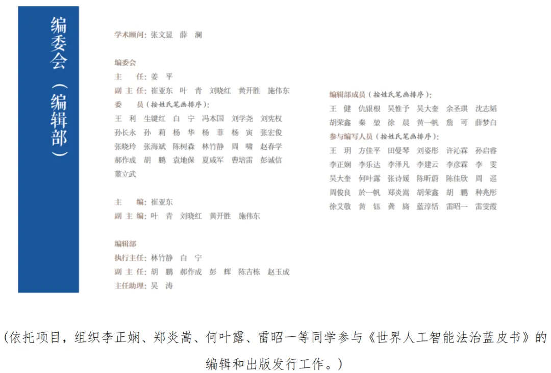 2.组建研究兴趣小组并参与权威成果编撰:组织本科生、研究生成立AI跃升计划研究兴趣小组,召开专题研讨会提升学生AI技术在法学领域的应用能力,选派小组学生参与《2025世界人工智能法治蓝皮书》的编辑与出版发行工作,强化学生的实践与科研能力。