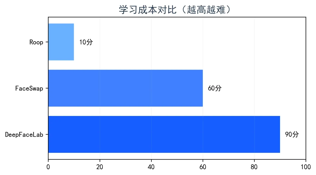 Roop几乎不用学,下载下来就能用;FaceSwap要花几天时间,熟悉一下操作;DeepFaceLab可能要花几周,才能把整个流程搞明白。