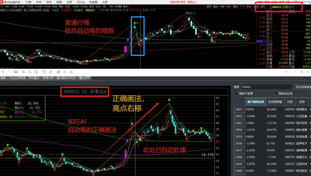 000032在10月10日到14日的K线,通达信的自动笔会直接画出一笔;但知行AI会经过严谨的【包含处理】和【右移原则】计算,最终正确地把它包含在向上的那一笔里面。