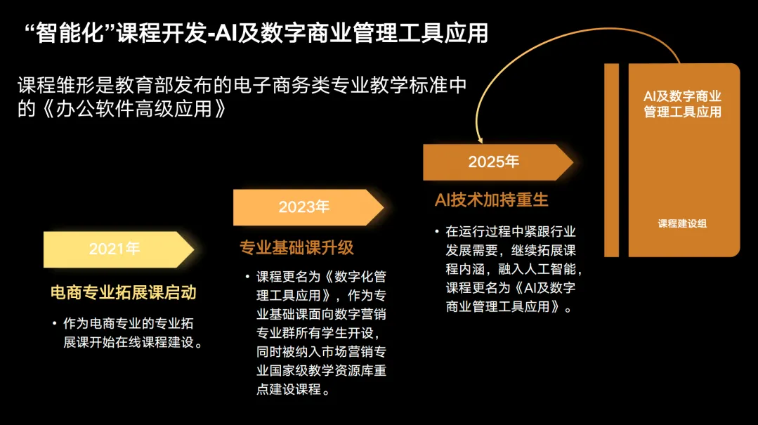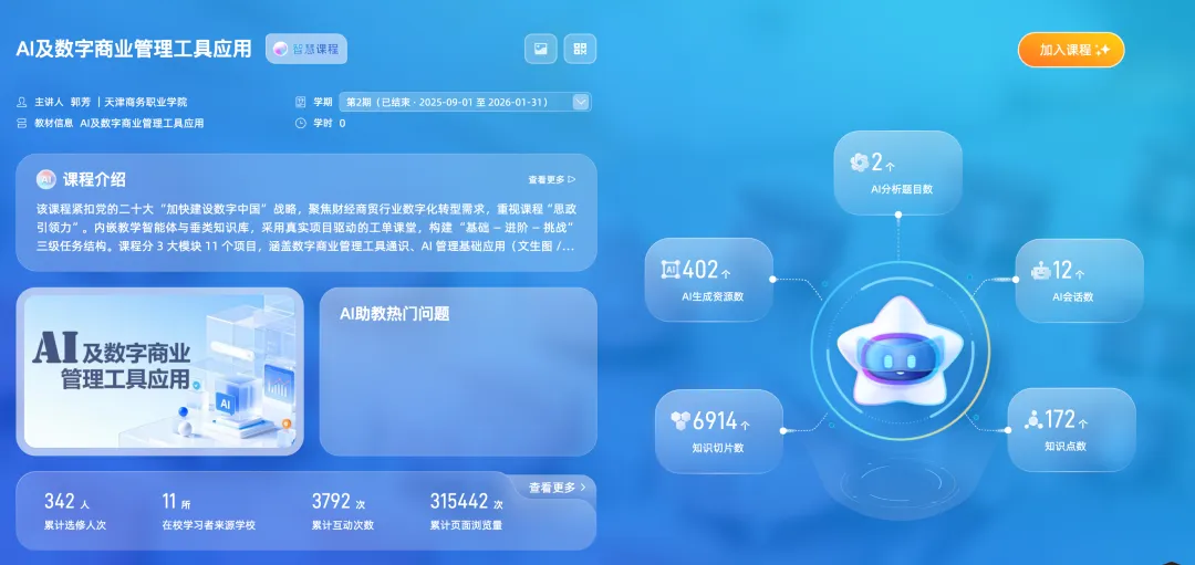 2025年,课程再次更名,升级为《AI及数字商业管理工具应用》。这不只是换了个名字,而是将人工智能技术从”工具选项”变成了课程的核心骨架,彻底重构了内容体系。与此同时,校企共研的AI智能体和数字教材建设同步推进,让这门课从线上课程升维为新形态数字教材。