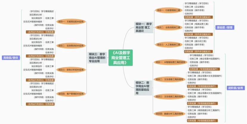 《AI及数字商业管理工具应用》作为专业群共享课,承担着整个数字营销专业群学生的数字技能通识教育任务,目标是帮助学生掌握”数字思维 + AI工具应用”的双重能力。