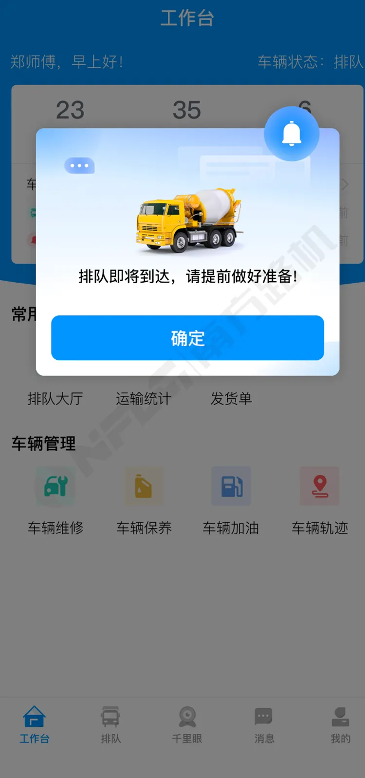 利用南方路机砼司机APP,司机自助排队后可在手机端实时显示排队进度,排队信息公开透明,有效防止调度徇私舞弊、插队等现象。同时,砼司机APP具有到号自动提醒功能,能够一对一、点对点通知司机抓紧进站领料,无需广播叫号、无需调度员电话提醒。安静、有序的车队管理不仅带来更高效的车辆流转,也大大提升了企业形象。