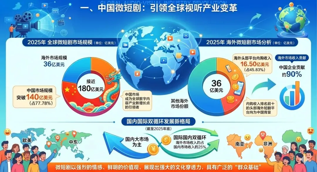 截至2025年底,中国微短剧海外市场收入约占国内市场收入的25%,初步形成以国内大市场为主、国际国内双循环发展新格局。微短剧以强烈的情感、鲜明的价值观,在出海过程中展现出强大的文化穿透力,已突破欧美、中东、南亚、非洲等跨文化市场,在全球具有广泛的“群众基础”。