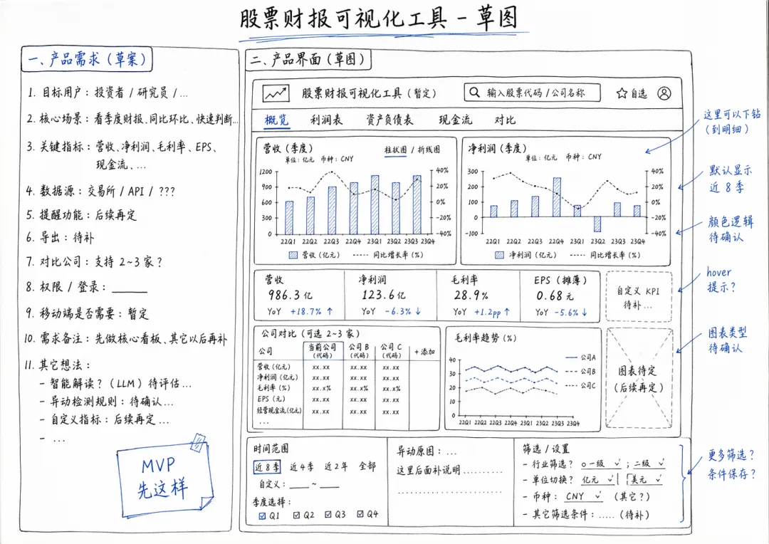 跟我的草图几乎一摸一样,而且可以点击交互,甚至是页面左下角的“MVP 先这样”也还原出来了,太细了!