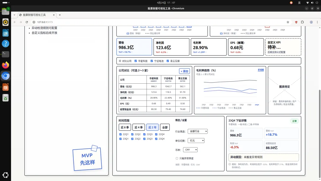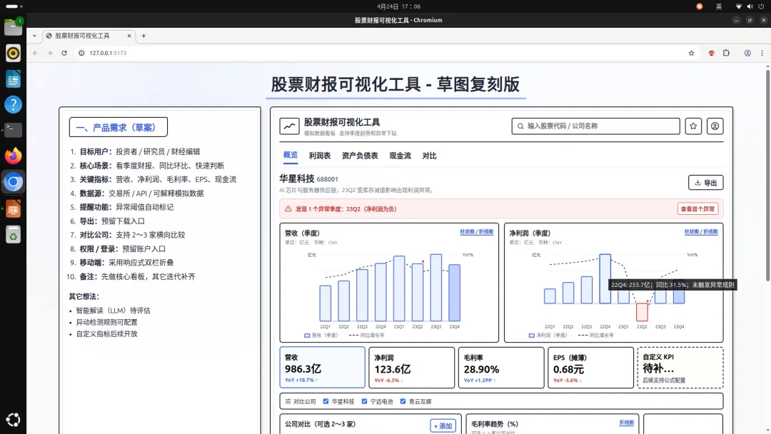 我先用gpt-image-2生成了一张“股票财报可视化工具”的产品草图,故意将产品需求写得不完整。然后再把这张草图给GPT-5.5让它做成成品,需要它完成前端、数据接入、交互、异常状态、测试,并用浏览器打开页面检查。