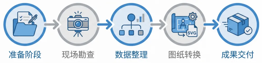 五个阶段: 准备阶段 → 现场踏勘阶段 → 数据整理阶段 → 图纸转化阶段 →成果交付阶段