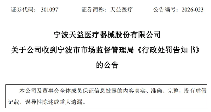 4月21日,天益医疗(301097.SZ)公告,公司收到宁波市市场监督管理局《行政处罚告知书》。