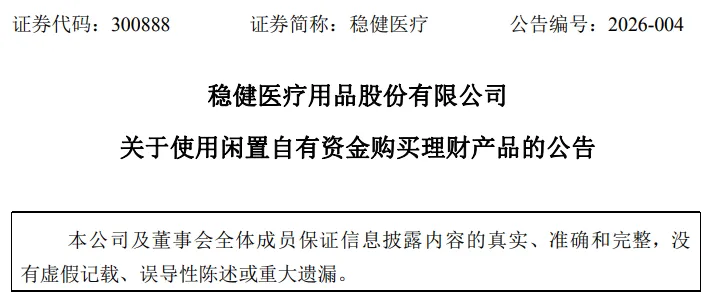 7.稳健医疗拟使用不超60亿元闲置自有资金购买理财产品