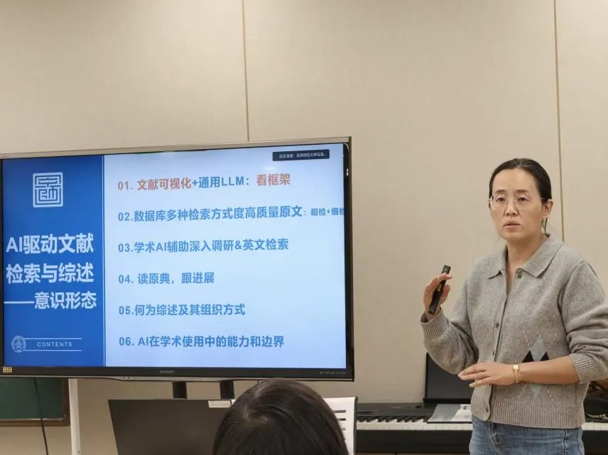 高冉老师充分结合马克思主义理论学科特点,系统讲解了大语言模型在文献检索、信息整合与学术综述撰写中的使用方法。她通过实操演示,指导学生利用AI工具精准获取学术资源,并强调在AI应用的边界与学术伦理,理性、规范使用。
